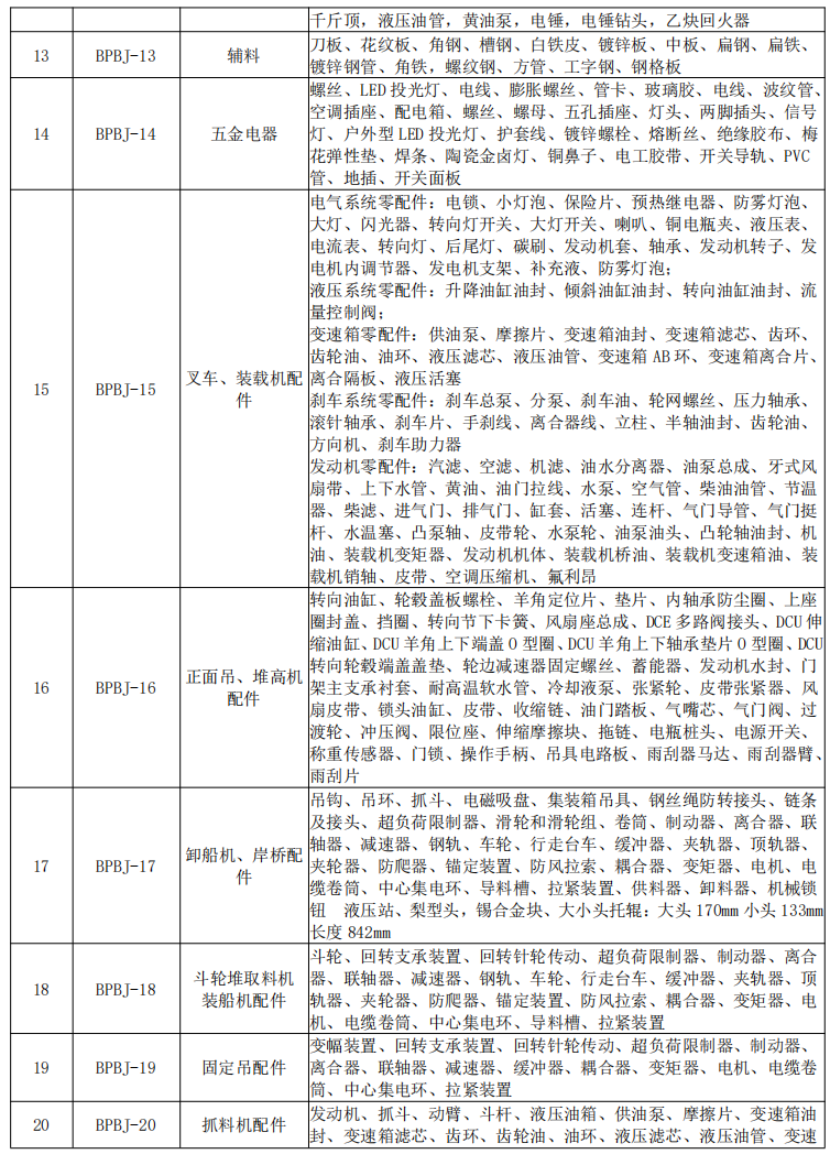 A部分:維修材料備品備件。招標范圍:為江蘇鹽城港控股集團有限公司2023年港口設備維修材料備品備件提供采購、運輸、驗收、售后服務等服務工作,共分為?20 ?個標段,具體情況如下: