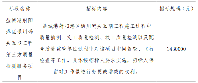 一、江蘇鹽城港射陽港開發集團有限公司負責實施的鹽城港射陽港區通用碼頭五期工程第三方質量檢測服務項目已具備招標條件,項目所需資金已落實,現通過公開招標方式邀請潛在投標人參加本項目的投標。