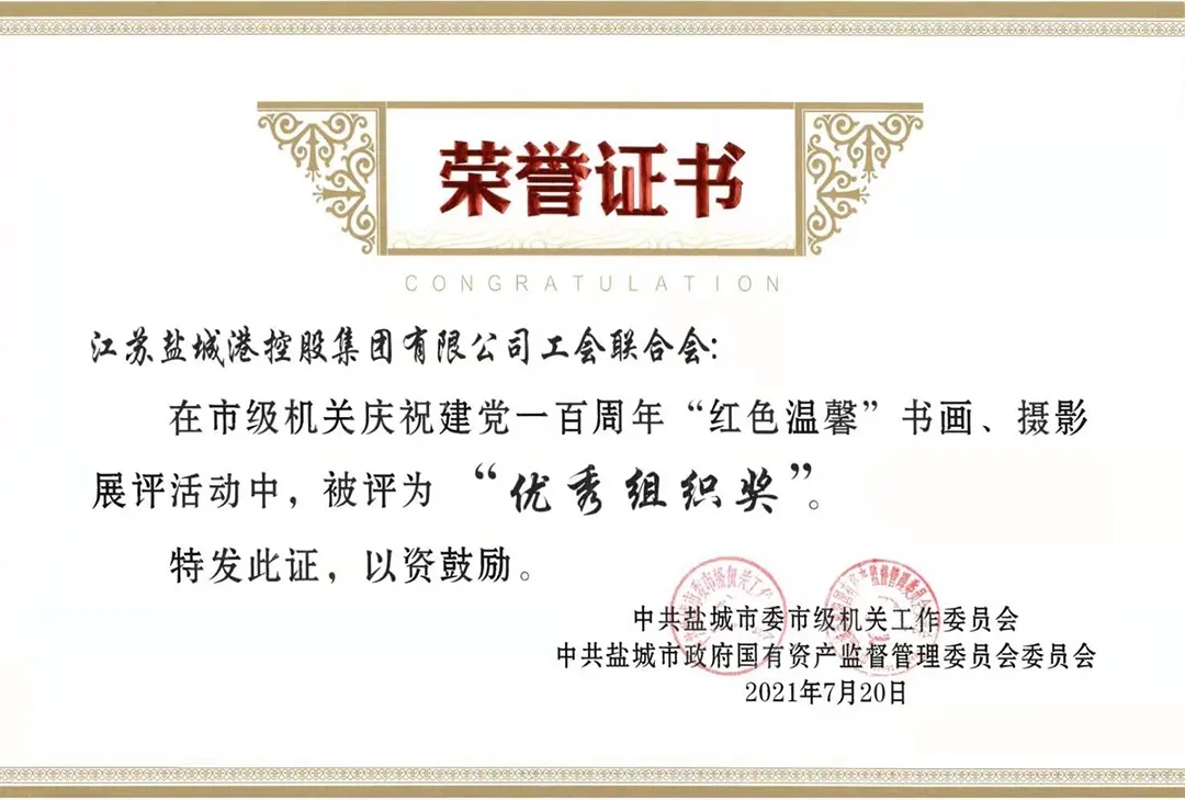 近日,中共鹽城市委市級機(jī)關(guān)工作委員會與中共鹽城市政府國有資產(chǎn)監(jiān)督管理委員會委員會發(fā)布《關(guān)于市級機(jī)關(guān)慶祝建黨一百周年“紅色溫馨”書畫攝影展評活動的表揚通報》,江蘇鹽城港控股集團(tuán)有限公司工會聯(lián)合會榮獲“優(yōu)秀組織獎”,響水港區(qū)張宜斌同志獲得“美術(shù)作品類 二等獎”。