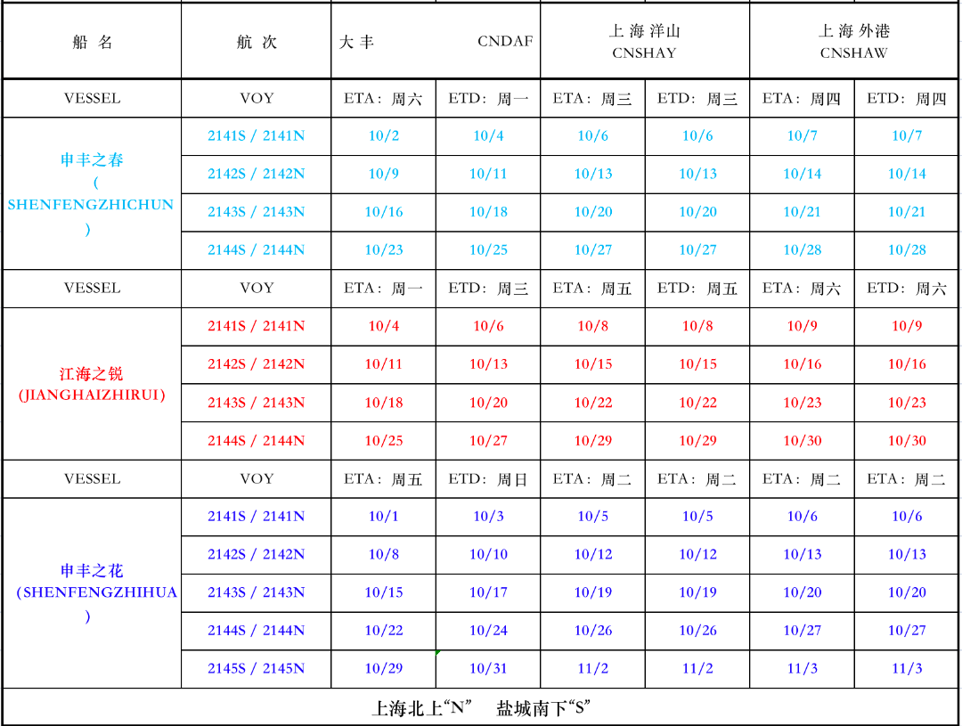 滬鹽專線2021年10月份沿海線船期表