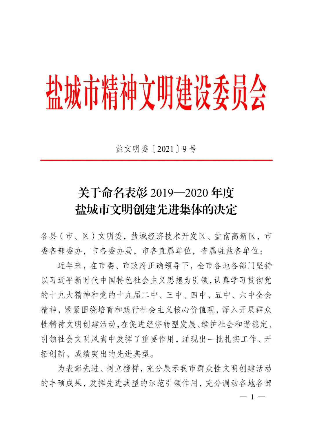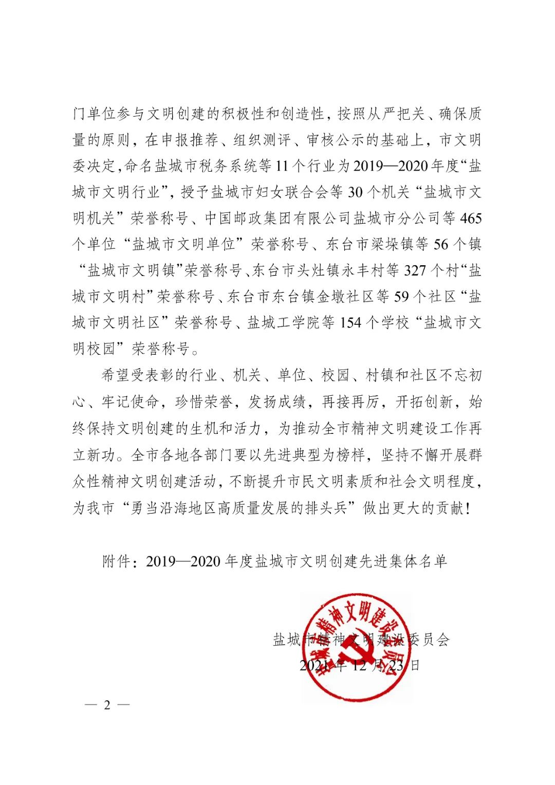 12月23日,鹽城市精神文明建設(shè)委員會(huì)發(fā)布《關(guān)于命名表彰2019-2020年度鹽城市文明創(chuàng)建先進(jìn)集體的決定》,集團(tuán)榮獲2019-2020年度“鹽城市文明單位”榮譽(yù)稱號(hào)。
