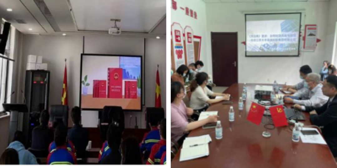 各子(控)公司積極響應集團部署,紛紛利用“學習強企·凝聚硬核”學習日,通過民法典學習手冊、民法典宣傳視頻、民法典讀書活動、律師講座、中國普法網答題活動等形式,組織員工集中學習,擴充知識儲備。大豐港區邀請律師就合同篇以案說法;港口公司送法進一線碼頭管理班組;文旅集團在酒店展播中國普法網《民法典伴你同行》《民法典新時代的圓規尺》等宣傳視頻實業集團深入社區,發放宣傳冊,重點宣傳高空拋物、飼養動物、建筑物區分所有權等法律知識,擔當普法惠民社會責任。
