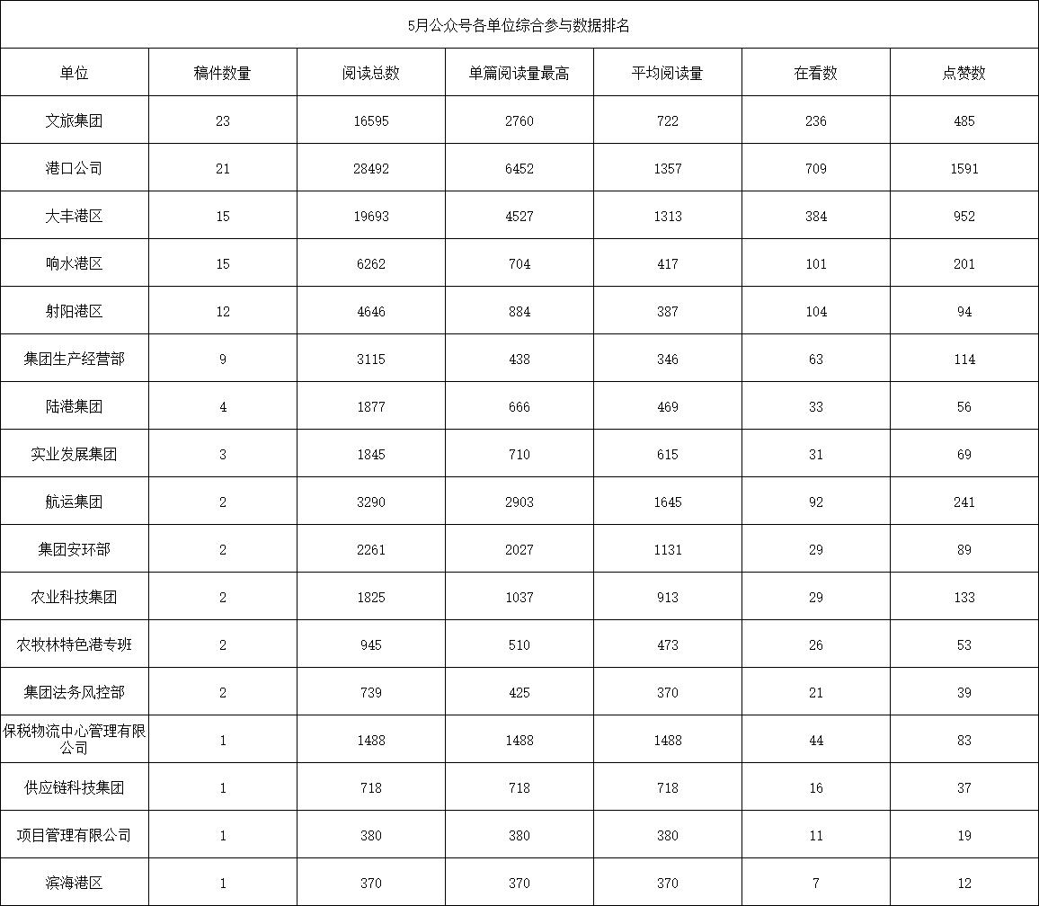 5月,集團微信公眾號共發布116篇文章??傮w閱讀數約9.5萬,各單位發稿更加活躍,希望大家保持一如既往的熱情,積極踴躍發稿,用最真實的數據,為集團沖刺“雙過半”貢獻文字力量。