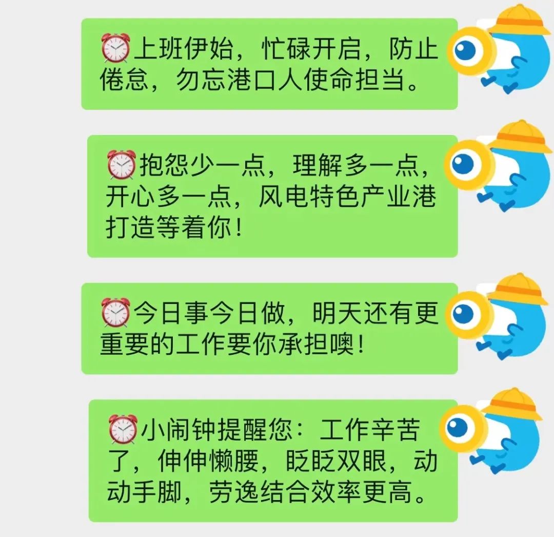 “鬧鐘小貼士”,既勵志又暖心,體現了港區對員工的人文關懷,激勵員工立足本職、又提醒員工注意勞逸結合、放松身心,更高效的完成工作。對此員工們紛紛表示,“鬧鐘小貼士”有利于讓大家更好地調整好自身狀態,練就“寬肩膀”,勇挑“千斤擔”,以更加昂揚的斗志,勇立潮頭,激情拼搏,為港區的發展和建設貢獻自己的一份力量。