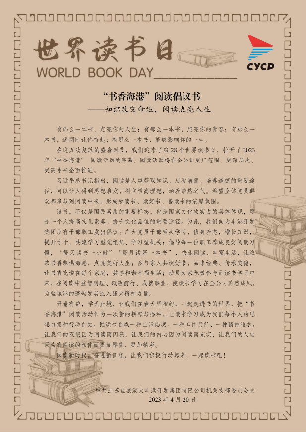 人間最美四“閱”天,不負春光書為伴。為深入學習貫徹黨的二十大精神,把握“學思想、強黨性、重實踐”的要求,連日來,鹽城港大豐港開發集團深入開展“學習二十大 書香潤初心”讀書月活動,積極引導黨員、群眾養成“多讀書、讀好書、好讀書”的良好習慣,使讀書學習在全公司蔚然成風,為鹽城港的蓬勃發展注入強大精神力量。