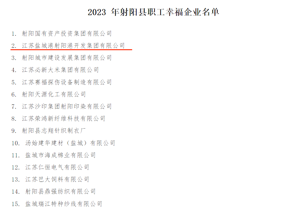近日,射陽縣總工會公示了2023年射陽縣“職工幸福企業(yè)”名單、縣工會工作爭先創(chuàng)優(yōu)綜合考核結(jié)果,射陽港開發(fā)集團榜上有名,再獲新榮譽。