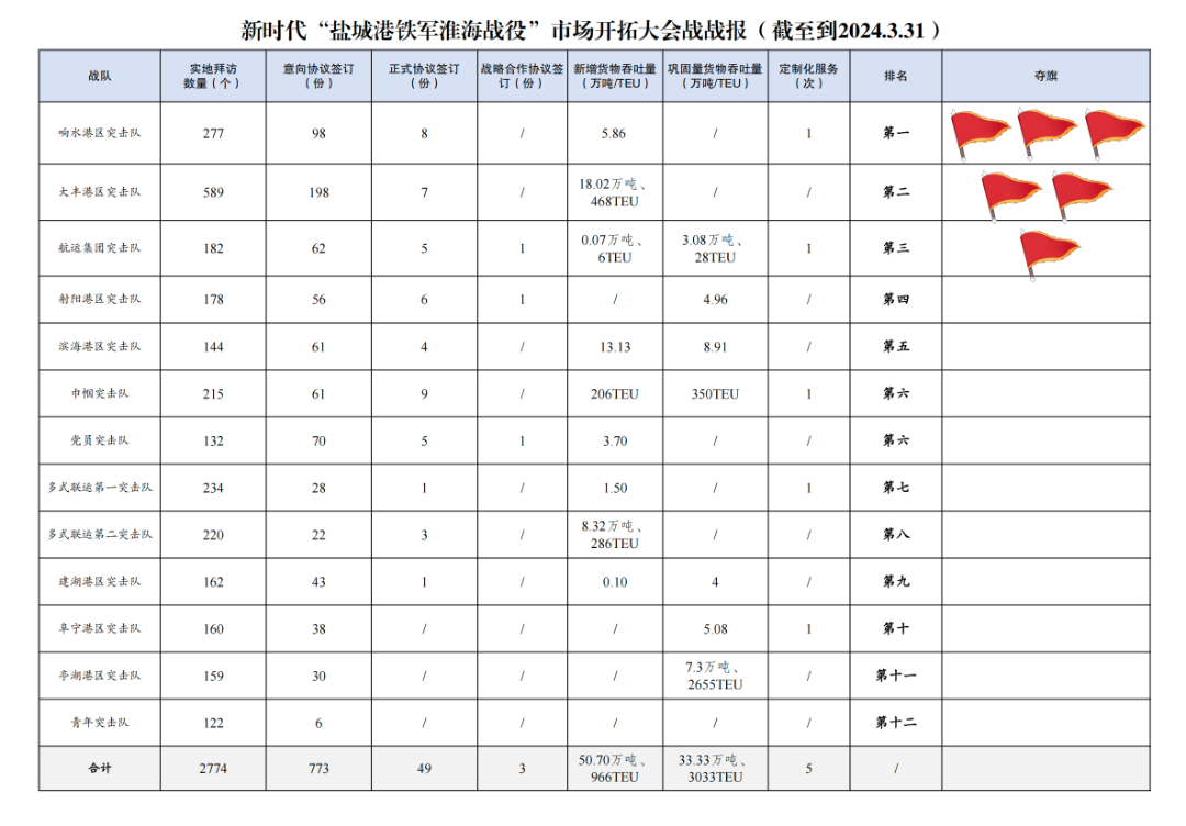 2.簽訂意向協(xié)議數量773份:其中大豐港區(qū)突擊隊198份,響水港區(qū)突擊隊98份,黨員突擊隊70份,航運集團突擊隊62份,巾幗突擊隊61份,濱海港區(qū)突擊隊61份,射陽港區(qū)突擊隊56份,建湖港區(qū)突擊隊43份,阜寧港區(qū)突擊隊38份,亭湖港區(qū)突擊隊30份,多式聯(lián)運第一突擊隊28份,多式聯(lián)運第二突擊隊22份,青年突擊隊6份。