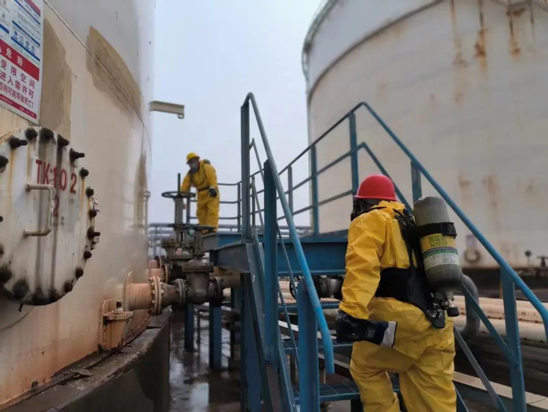 通訊警戒組在安全區(qū)域拉起警戒線,救援組迅速穿戴防護(hù)用品,緊急切斷TK102閥門。