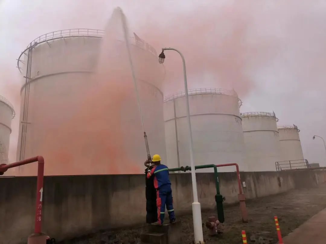 火情失控后,應(yīng)急搶險組用移動泡沫裝置滅火,并開啟噴淋對儲罐降溫,同時使用水炮對儲罐加強(qiáng)降溫。在各小組的有序配合下,本次演練圓滿結(jié)束。