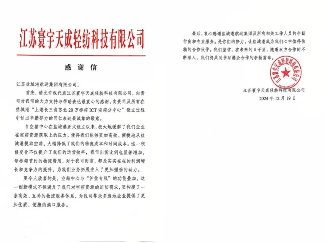 近日,鹽城港航運(yùn)集團(tuán)收到江蘇寰宇天成輕紡科技有限公司一封飽含濃濃謝意的信箋,信中字字深情,句句滾燙,高度贊揚(yáng)了鹽城港為“上港長三角蘇北20萬標(biāo)箱ICT空箱分中心”的設(shè)立啟用所付出的努力,并對鹽城港航運(yùn)集團(tuán)主動(dòng)作為、精誠服務(wù)、共贏發(fā)展的合作精神表示衷心感謝。