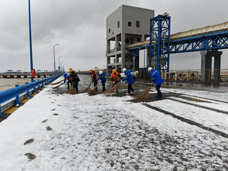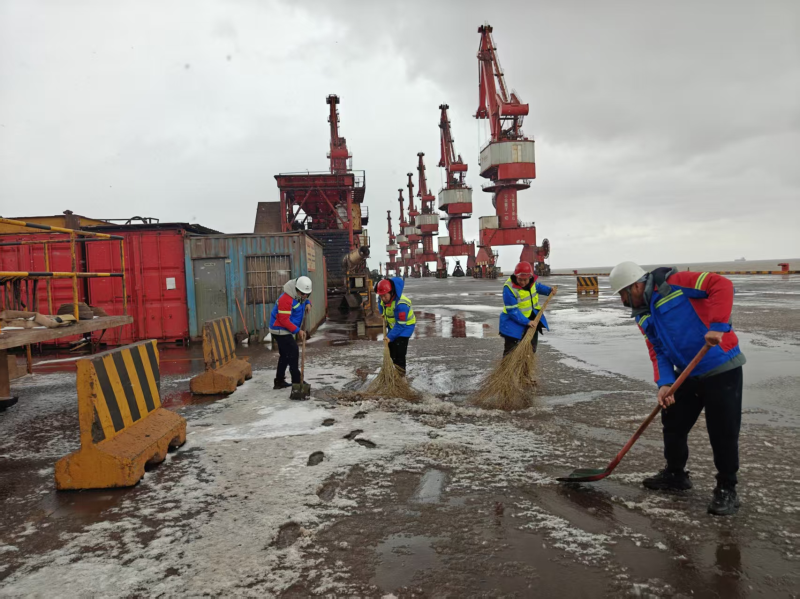 保稅物流中心領(lǐng)導(dǎo)班子靠前指揮,提前備足工業(yè)鹽等防凍融雪物資,組織全體干部職工開(kāi)展鏟雪除冰行動(dòng)。大家不畏嚴(yán)寒、分工有序,重點(diǎn)清掃場(chǎng)區(qū)主干道、物流出入口、停車(chē)場(chǎng)等關(guān)鍵區(qū)域,黨員干部沖鋒在前,青年職工奮勇?lián)?dāng),經(jīng)過(guò)數(shù)小時(shí)連續(xù)作業(yè),徹底清除主要通行區(qū)域積雪積冰,有力保障了物流車(chē)輛暢通與生產(chǎn)作業(yè)有序運(yùn)行。濱海港區(qū)各單位更是多點(diǎn)發(fā)力,投資公司優(yōu)化作業(yè)流程和行車(chē)路線,設(shè)立現(xiàn)場(chǎng)管理員科學(xué)調(diào)度;港務(wù)公司與客戶高效聯(lián)動(dòng),保障貨源供應(yīng)鏈暢通;物流公司聚焦技術(shù)攻堅(jiān)、市場(chǎng)拓展和人才培養(yǎng),在寒冬中積蓄發(fā)展動(dòng)能。