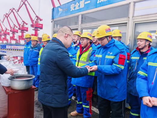 在射陽(yáng)港區(qū),凜冽海風(fēng)裹挾著濕氣,體感溫度低至零下十余度。港區(qū)領(lǐng)導(dǎo)帶領(lǐng)“暖心送粥隊(duì)”穿梭于各個(gè)作業(yè)區(qū),將精心熬制的臘八粥逐一送到在崗員工手中。為契合一線員工“寒夜堅(jiān)守、高強(qiáng)度作業(yè)”的工作特性,港泊鶴灣酒店提前數(shù)日籌備,餐飲團(tuán)隊(duì)精選東北糯米、寧夏紅棗、新疆核桃等十余種藥食同源食材,特別添加燕麥、芡實(shí)等耐饑養(yǎng)胃原料,既遵循“七寶五味粥”傳統(tǒng)古制,又強(qiáng)化了暖身抗寒功效。剛完成船舶系纜作業(yè)的員工們搓著凍紅的雙手圍坐分享,滾燙的粥香不僅驅(qū)散了寒意,更映亮了一張張淳樸真摯的笑容。