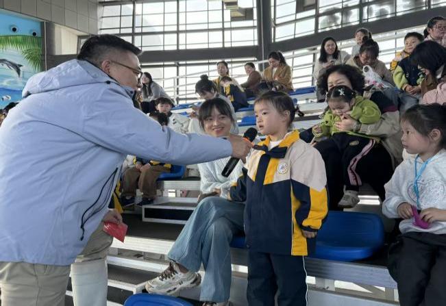 走進海洋劇場,一池碧水微漾。海豚循著馴養員的動作指令如閃電般破水而出,騰空、旋轉、頂球、水中芭蕾……一氣呵成,引得孩子們齊聲歡呼:“哇!”演出間隙,科普講解員拋出一個個小問題:“海豚有什么顏色呀?”小手齊刷刷舉起,爭先恐后:“有粉色、灰色、白色、藍色……”,“好,那你們知道海豚用什么呼吸呀?”“鼻孔!”“不對,是頭頂的呼吸孔!”——在陣陣笑聲中,海洋的秘密悄悄住進了孩子們心里。