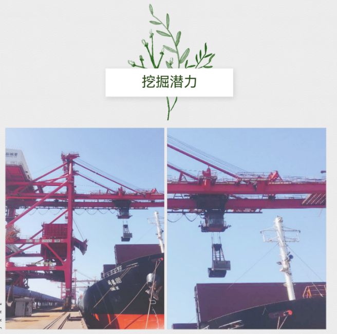 深入挖掘設(shè)備潛能,實(shí)施了一系列“賦能升級(jí)”計(jì)劃。改進(jìn)卸船機(jī)水渣抓斗工藝,從原有的14m3、21T的水渣抓斗采購16.9m3、25T的抓斗,使其在滿足額定起重量要求的同時(shí),具備煤炭備用抓斗的功能;對(duì)堆料機(jī)進(jìn)行流量升級(jí),通過改造漏斗、支架等細(xì)節(jié),平均流量從1800T/H提升至2200T/H,在提高堆料機(jī)的穩(wěn)定性和效率的同時(shí),也降低了新設(shè)備采購的成本。