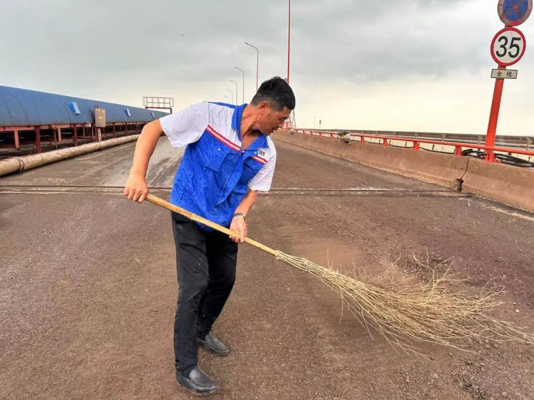 在糧食碼頭引橋,散落的貨物殘渣隨處可見,清掃隊員們迅速行動,認真細致地進行清理,確保做到不漏項、不脫節(jié)、無死角、無盲區(qū)。