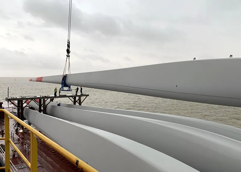 據悉,此次2套大型風電葉片采用門座式起重機的作業方式裝卸,風電葉片各長71.4米,兩套總重達280噸,該批次風電葉片將從濱海港區裝船啟運至浙江岱山機位項目處。
