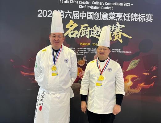 近日,在2026第六屆中國創意菜烹飪錦標賽--名廚邀請賽的頒獎舞臺上,港泊鶴灣酒店的廚師李青嶺、劉明園兩位廚師以出色表現憑借《掌上明珠》《鮑汁春筍扣鴨脯》《鶴鄉靚湯海鮮盅》等特色菜品,雙雙榮獲個人賽金獎。